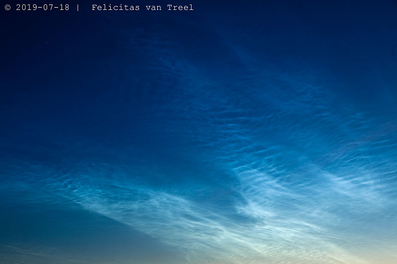 heute morgen war die Erwartung groß. Es waren NLC's auch zu sehen, aber nicht in der Ausdehnung wie am Abend zuvor. Trotzdem schön anzusehen und schließlich nicht regelmäßig zu beobachten auf dem 49.ten Breitengrad. Leider verblasste das Display innerhalb einer halben Stunde deutlich. Die zwei Bilder während der besten Phase. Equipment: Sony A7s, Objektiv SEL2870.