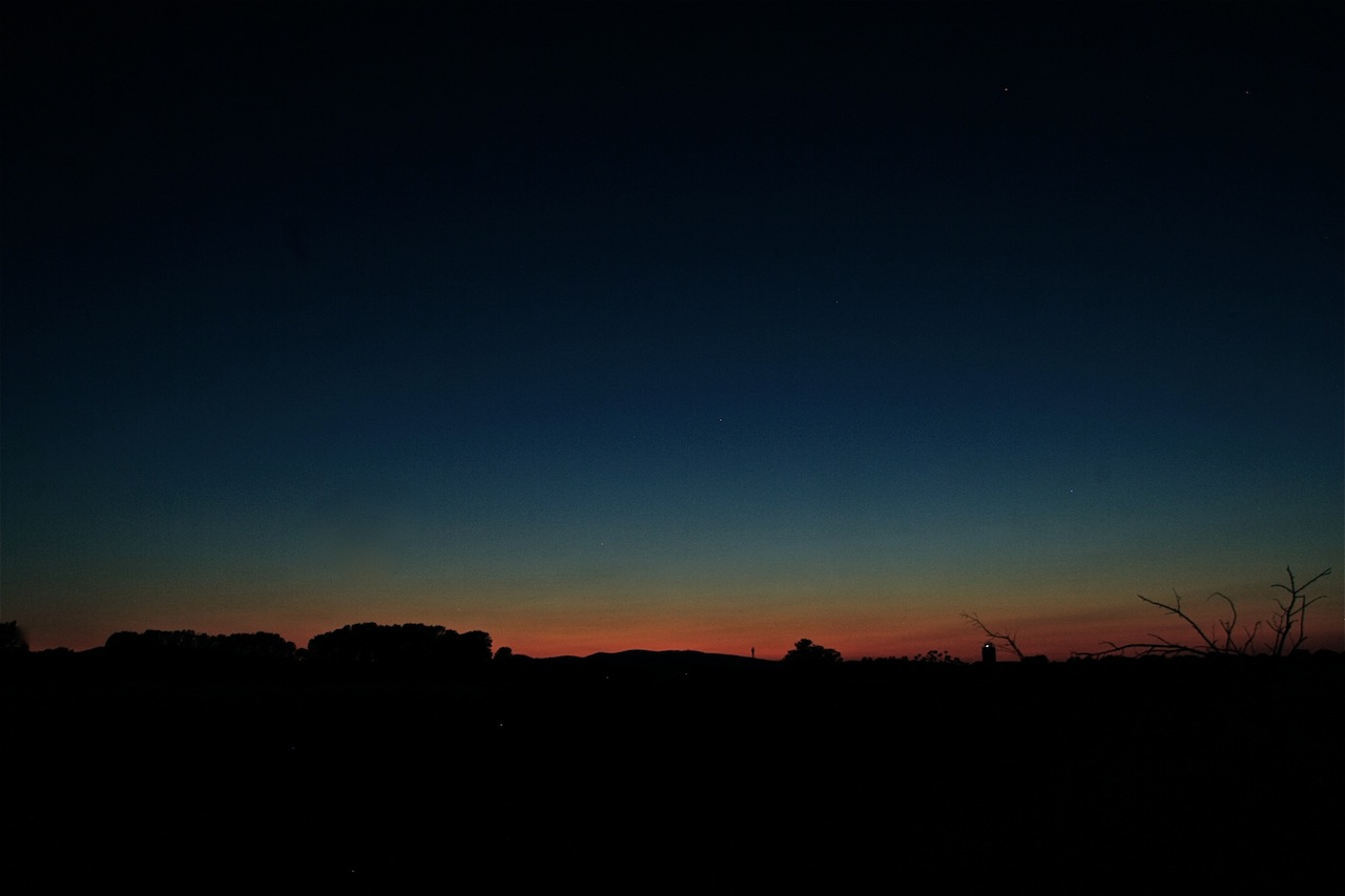 Zu diesem Zeitpunkt war der Dämmerungshorizontalstreifen extrem orange, intensiviert durch das anfangs weiße "Band", darüber stand ein nicht weniger intensives Purpurlicht und der tiefblaue Himmel über mir im Zenit, war auffällig violett durchfärbt. Mit Blick in Richtung OSO, war zuvor eine ausgeprägte Gegendämmerung mit Gegenpurpurlicht zu beobachten. Der Erdschatten hob sich markant ab. Das reinste Farbenspiel.