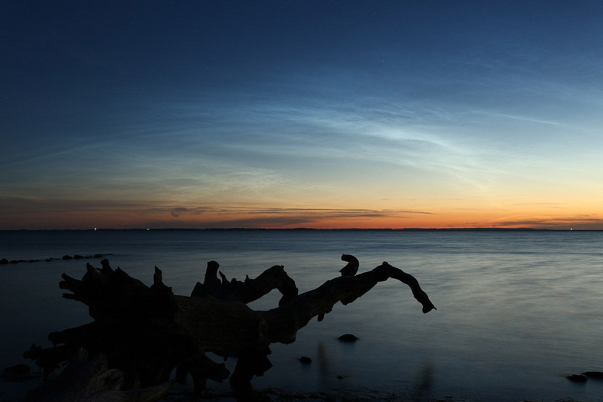 Von dort aus ging es weiter nach Norden, an den Strand von Gahlkow. Die nächsten beiden Fotos zeigen die leuchtenden Nachtwolken einmal im Weitwinkel und einmal als Detailaufnahme.