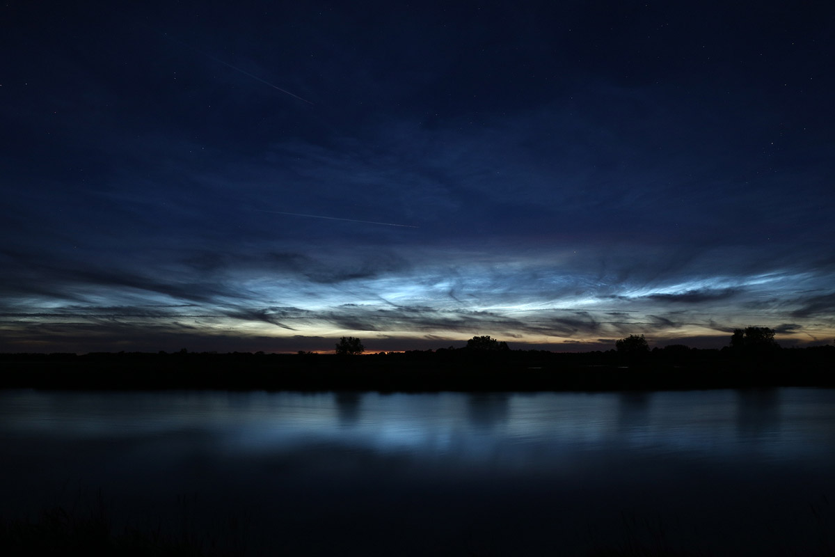 Die erste Sichtung gelang mir gegen 23:00 Uhr noch vom Schlafzimmerfenster aus, allerdings nur in einer Lücke zwischen zwei Bäumen. Das Foto erspare ich euch, genauso wie meine ersten Bilder vom Ryck bei Greifswald. Dort angekommen musste ich aber leider feststellen, das die sehr interessanten NLC sich erfolgreich hinter allerlei Zirren versteckten. Man konnte die leuchtenden Nachtwolken und auch teilweise sehr interessante Muster und Strukturen durchaus erkennen, es war aber alles deutlich mit Zirren überdeckt. Es ist wirklich schade, das diese interessanten NLC nicht bei klarem Himmel zu sehen waren.