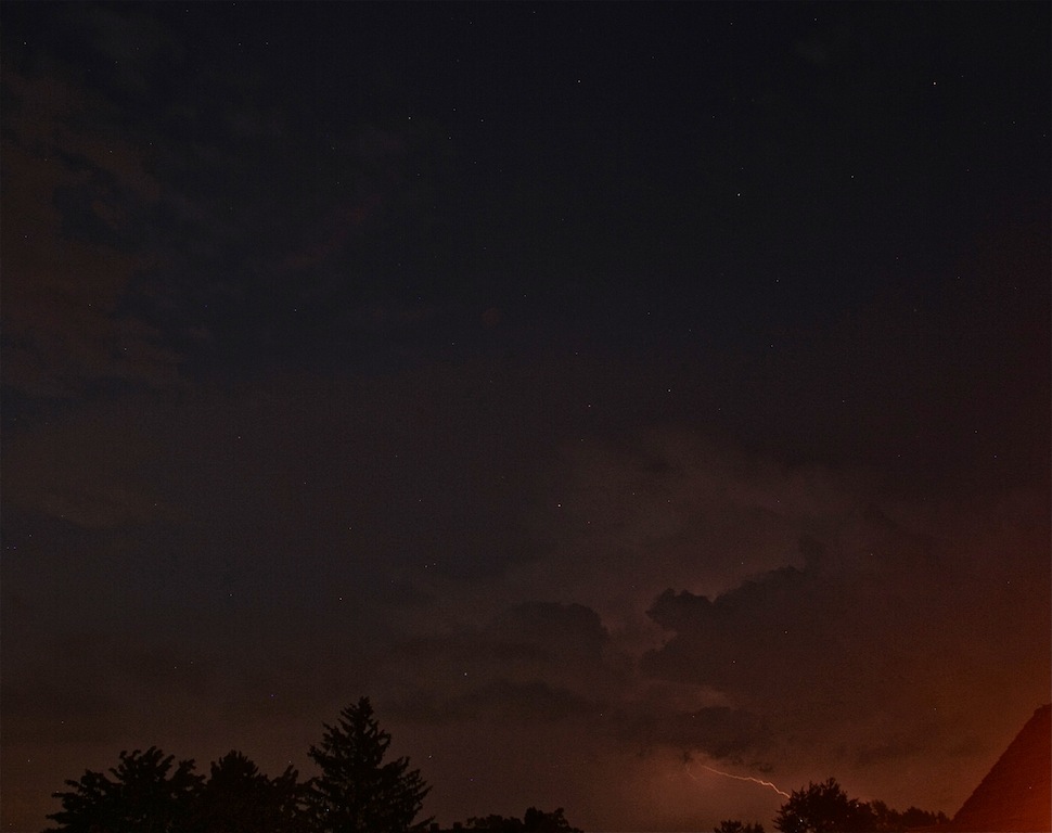 Das Gewitter entlud sich trotz Aufgebot beeindruckender Cb´s am Nachmittag erst gegen Nacht so nach 22h lautlos über Wien. Aufgenommen südlich von Wien in ca. 29Km Entfernung. In nördlichen Bezirken Wiens soll ja was runtergekommen sein, war aber nicht so spektakulär. Der Cb Spätnachmittags stand im Nordwesten und warf einen Schatten bis weit in den Osten - das Haus steht leider dazwischen.