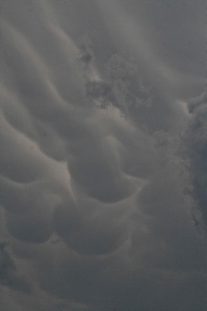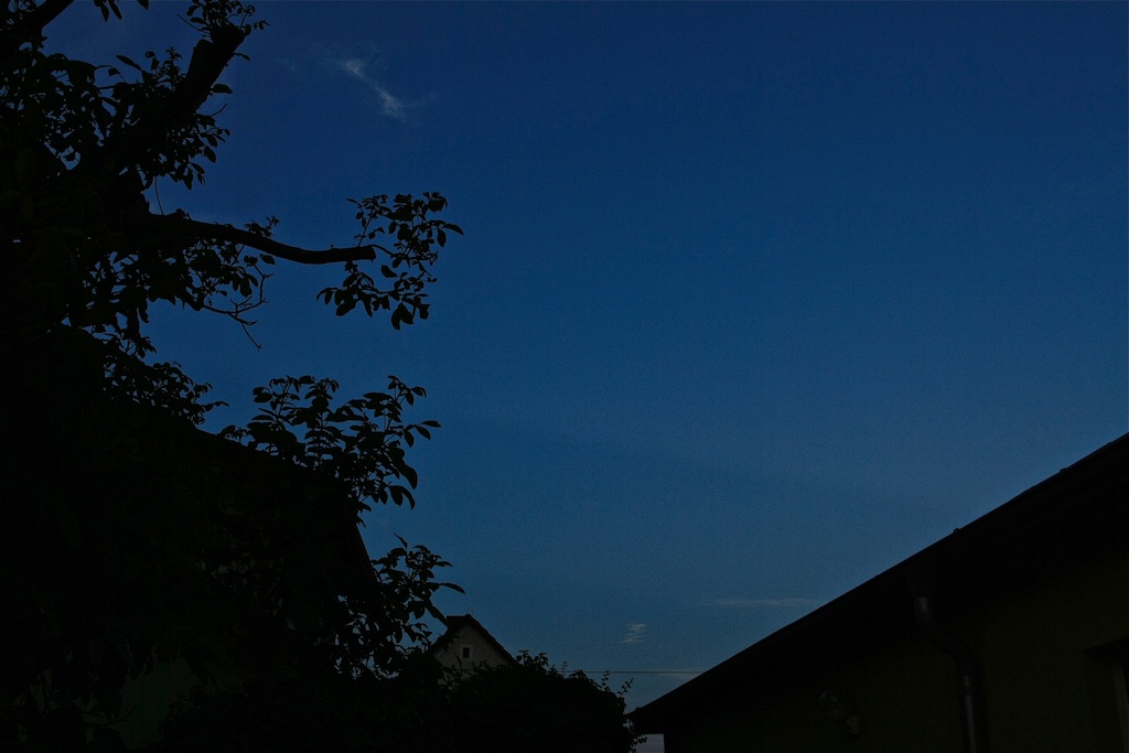 Bereits in den letzten Tagen fiel mir auf, daß der Abendhimmel im Nordwesten ungewöhnlich hell und gelblich war. Heute sah ich zufällig um 21.40 MESZ, also noch vor Sonnenuntergang, im Nordwesten einen weißen Streifen, wie ein Zwischending aus Cirrus und NLC. Kurz nach Sonnenuntergang um 22 Uhr war dann im Nordwesten ein Muster aus hellen und dunklen Streifen oder Schlieren zu sehen.