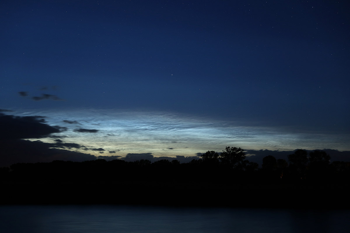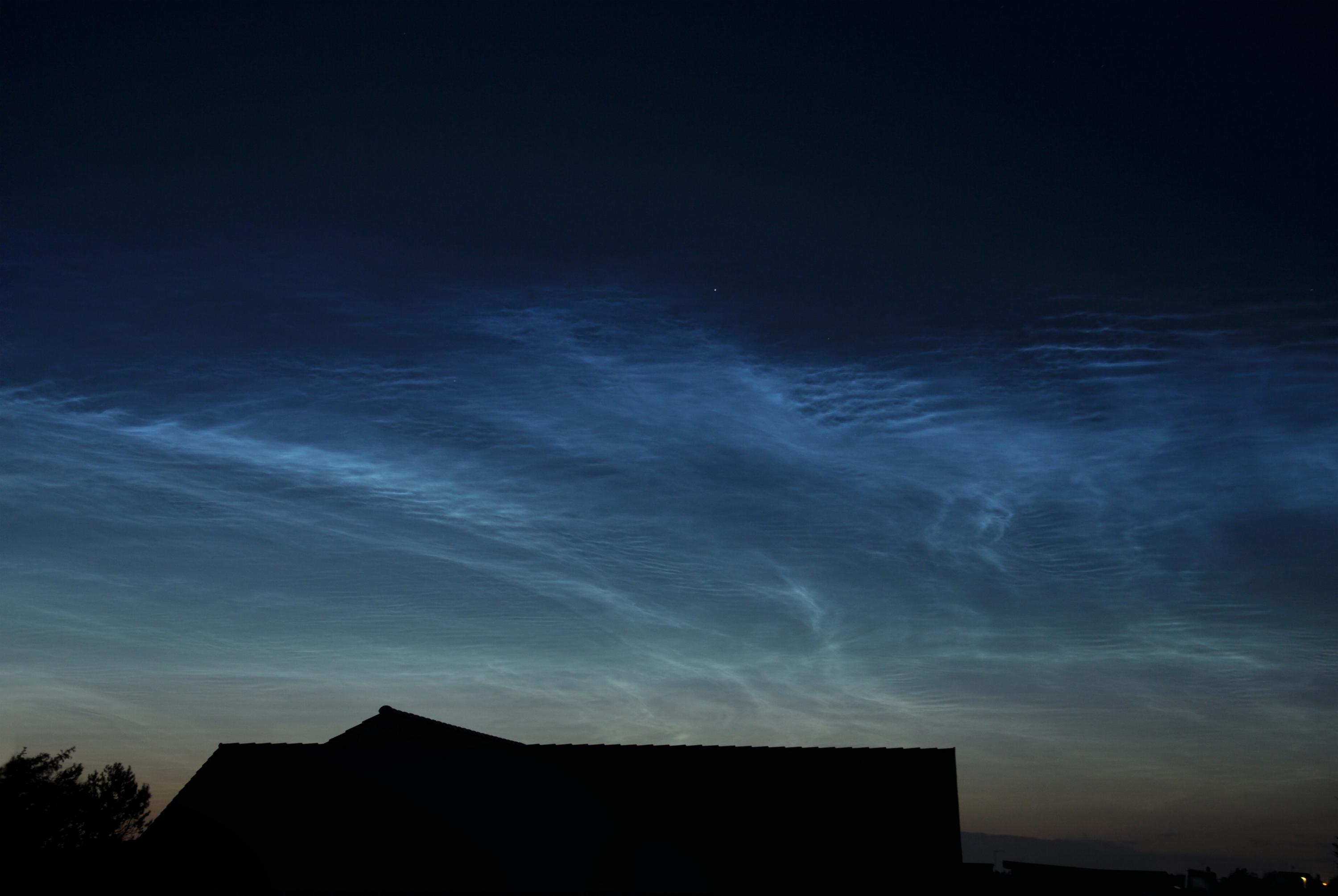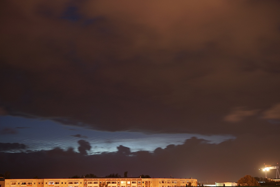 Da die im Internet gemeldeten NLC auf meinem Balkon leider doch nicht zu sehen waren, beschloss ich mich trotz nur 14 Grad und grausamen Wind die Wohnung zu verlassen und mal persönlich nach den NLC zu sehen. Was ich nicht wusste: Ich befand mich dabei in einem Wettrennen mit den Wolken, die dabei waren, die NLC zu verdecken. Aber ich kam gerade noch rechtzeitig, um ein schönes Display leuchtender Nachtwolken zu fotografieren.