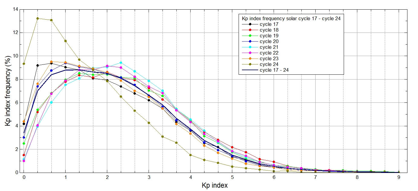 Anfang 2018 habe ich eine identische Auswertung der Kp-Indexverteilung für den Zeitraum seit 1932 (seitdem gibt es Kp-Indexwerte) ausgewertet und sie im Laufe der Zeit immer wieder aktualisiert. Sehr schnell stellte ich fest, dass die Häufigkeitsverteilung, wenn man sie getrennt pro Sonnenzyklus auswertet, innerhalb eines begrenzten Kp-Bereichs um 2- praktisch keine Variation zeigt. Egal wie stark oder schwach ein Sonnenzyklus ist! Für die jährlich aufgetragenen Verteilungen gilt das auch, aber nicht so ausgeprägt. Wie zu erwarten, nimmt der Anteil hoher Kp-Werte in starken Sonnenzyklen zu und umgekehrt der Anteil kleiner Werte im Falle eines schwachen Sonnenzyklus. Aber die Häufigkeit um Kp = 2- ändert sich praktisch nicht. Das machte mich als Physiker natürlich sehr neugierig…