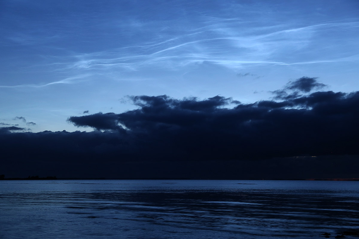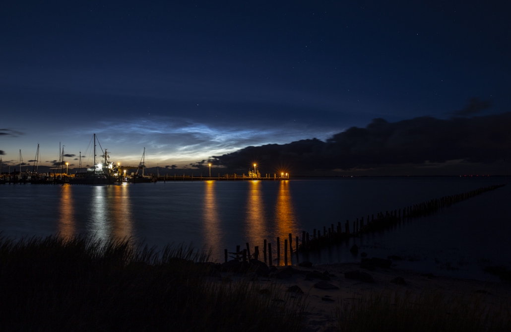 Moin zusammen, die NLC's dieser Nacht habe ich am Seezeichenhafen bei Wittdün auf Amrum beobachten dürfen. Es war eine sehr schöne NLC-Nacht am Wasser, welche immer mal wieder durch niedrige Wolkenfelder und Schauer geprägt war. Letztere durfte ich zum Glück ausschließlich in der Ferne beobachten.