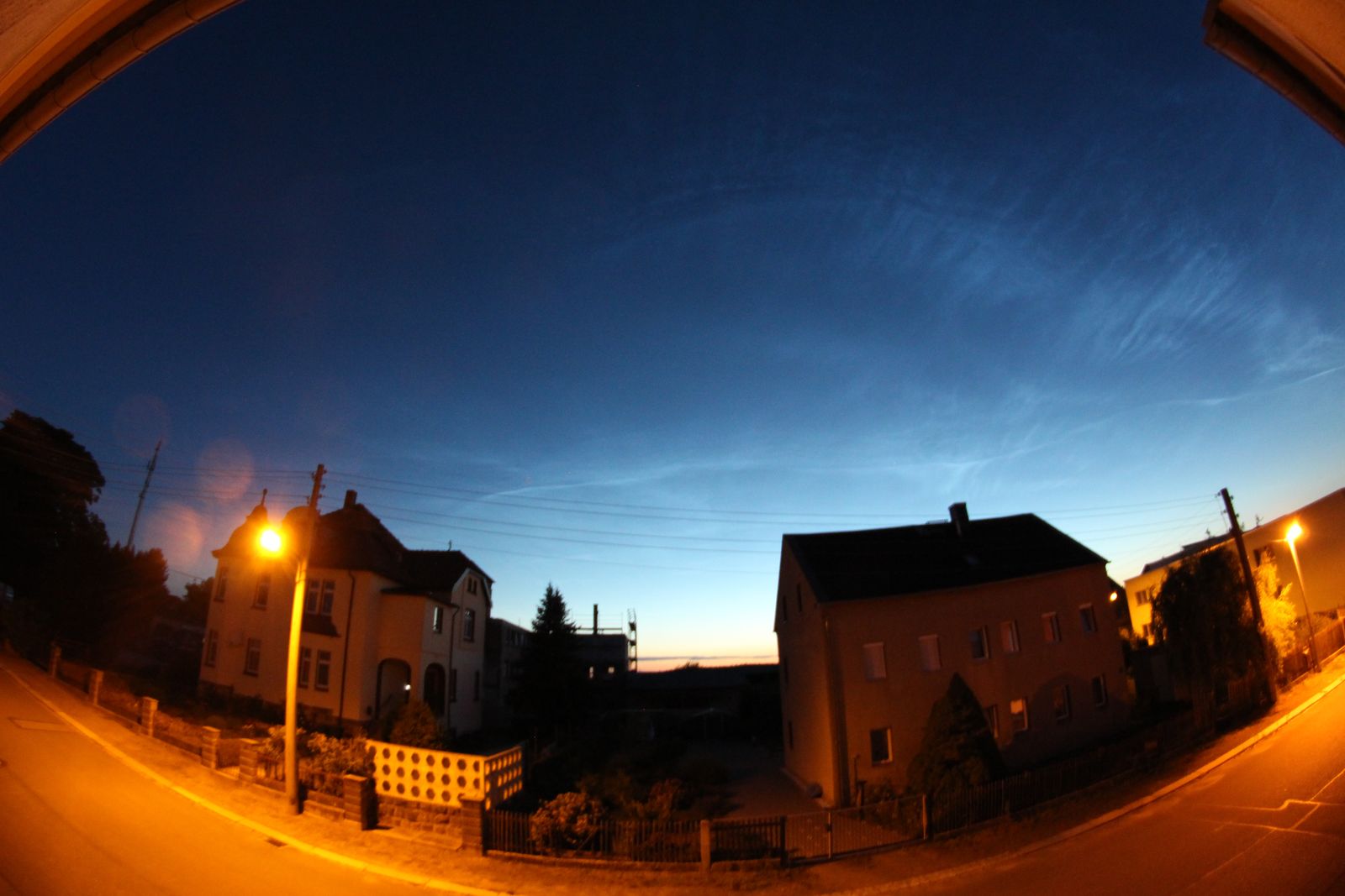 Das war wirklich beeindruckend... Ich bin so gegen 3.30 Uhr mal auf den Balkon gegangen und die NLCs breiteten sich immer weiter aus. Erst waren sie nur im Nordosten, dann zogen sie fast über den ganzen Himmel! Leider war es schon recht hell draussen, ich hatte nur die Bridgekamera zur Verfügung und kein Stativ. Das Bild hier ist mit Blickrichtung Südosten, der Fernsehturm ist Luftlinie etwas 4,5 km entfernt.