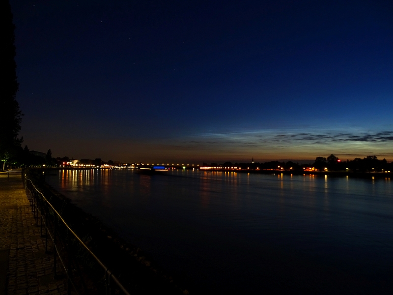 die Leuchtenden Nachtwolken am Morgen des 03.07.2019 boten auch in Bonn ein durchaus beeindruckendes Schauspiel. Ab etwa 03:40 MESZ befand ich mich zunächst an einem Aussichtspunkt auf der Abbruchkante der Niederterrasse des Rheins, wo ich zusammen mit den NLCs die Plejaden ablichtete (Abb. 1). Da das Blickfeld durch Bäume etwas eingeschränkt war, bin ich dann zum Ufer hinuntergegangen, wo das Display in seiner vollen Ausdehnung zu überblicken, aber selbst mit Weitwinkel nur in drei Teilaufnahmen (Abb. 2 - 4) zu dokumentieren war.