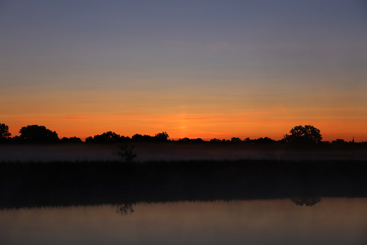 Am frühen Morgen der 18 Juli, nach einer langen Nacht voller faszinierender leuchtender Nachtwolken, konnte ich zum Morgen hin kurz vor Sonnenaufgang noch eine Lichtsäule über dem Horizont beobachten und das schon knapp 40 Minuten vor Sonnenaufgang. Die Fotos wurden dann aber erst später am leicht nebeligen Flüsschen Ryck gemacht.