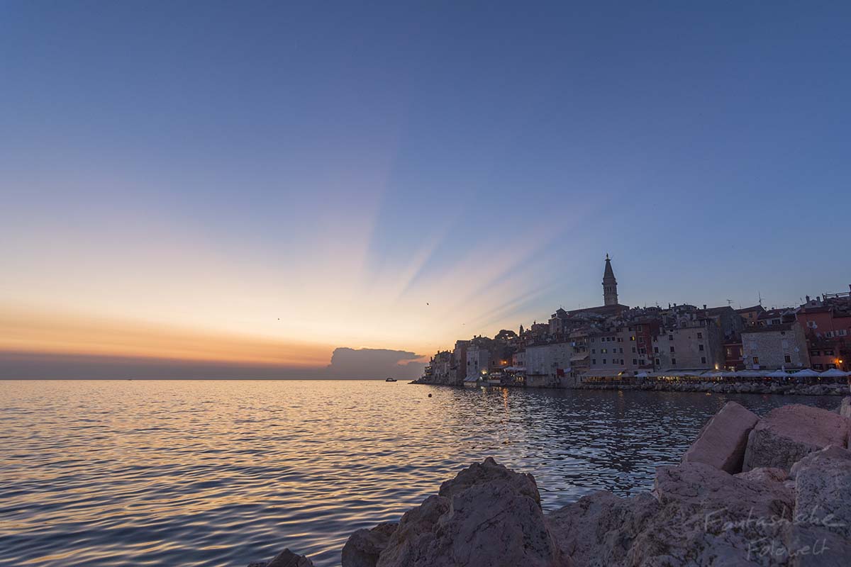 Am 30.07.2019 gab es dort zum Sonnenuntergang sehr intensive Dämmerungs- und Gegendämmerungsstrahlen. Zum Glück haben wir sowieso vorgehabt, den Sonnenuntergang in Rovinj zu fotografieren, sodass die große Kamera samt Ultraweitwinkel dabei war.