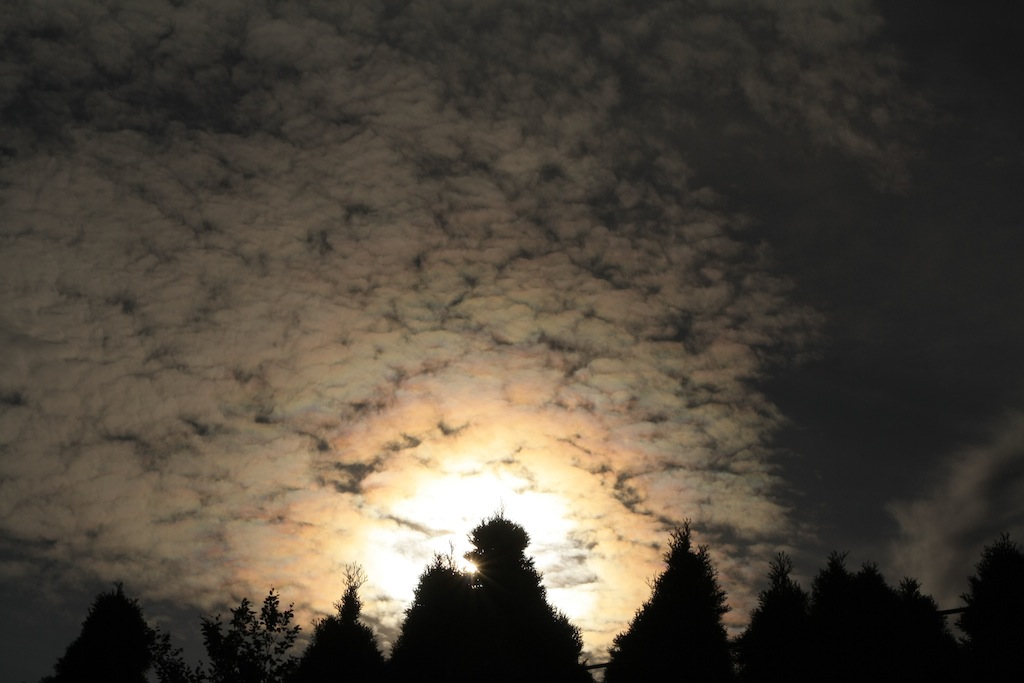 so langsam breitet sich die Bewölkung einer Warmfront über den Osten Österreichs aus, bevor der Cc ganz zum Cs wurde, zeigten sich zum einen eine schöne Sonnenkorona in morgendlicher Kühle bei 16 Grad C und Windstille, als auch ein paar Punchholes als auch Punch-Schneisen, diese Wortwahl ist von mir, weil ich finde, dass man hier deutlich sehen kann, wie das ausfallende Eis, welches sich an den Kerosinteilchen der startenden und landenden Flugzeuge hier ganz in der Nähe gebildet hat ausfällt und ganze Schneisen ins Gewölk schneidet, also das Material des Cc mit sich vereint und runterreist, so der optische Eindruck.