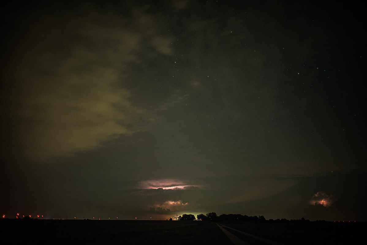 bin gestern Nacht mit der Hoffnung auf Polarlicht zum benachbarten Aussichtsturm "Hessenstein" gefahren. Polarlicht war nix, dafür aber tolles Wetterleuchten der nach Norden abziehenden Gewitterfront. Dazu gesellte sich auch etwas grünes Airglow.