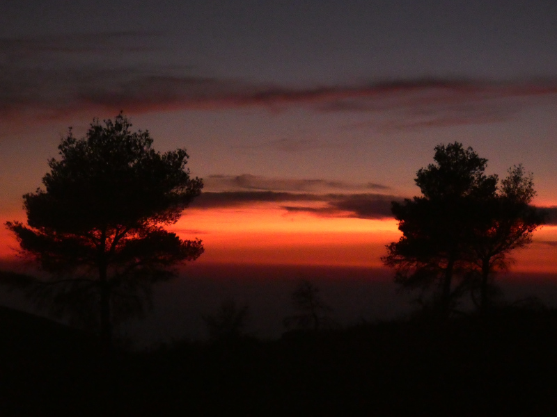 Wäre dort hinten nicht das Meer gewesen, hätte man denken können, dort sei irgendwo ein riesiger Waldbrand. An den inzwischen schon schwarzen Cirren ist zu erkennen, daß die angestrahlten Wolken sich viel höher befanden und irgendwo in der Stratosphäre hängen mußten.