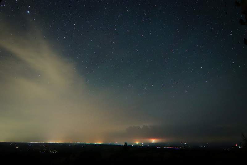 bin gestern Nacht mit der Hoffnung auf Polarlicht zum benachbarten Aussichtsturm "Hessenstein" gefahren. Polarlicht war nix, dafür aber tolles Wetterleuchten der nach Norden abziehenden Gewitterfront. Dazu gesellte sich auch etwas grünes Airglow.