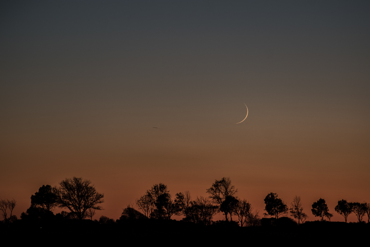 Hier wäre ein solches Unterfangen trotz Mondalters von etwa 36 Stunden kaum machbar gewesen, da sich die Ekliptik zur Zeit abends nur sehr flach über den Westhorizont erhebt und der Mond schon 10 min nach Sonnenuntergang nur noch 2 Grad hoch stand.