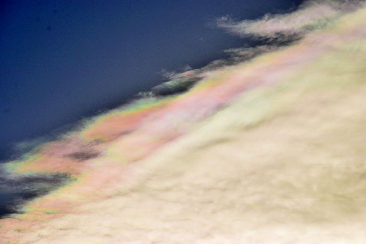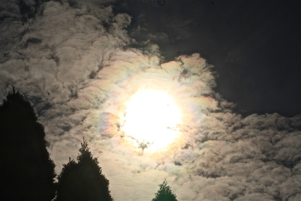 nach einer strengen Kältennacht am 8.Oktober knapp am Gefrierpunkt vorbei, zeigte sich vormittags im Südosten eine intensive Korona um die Sonne. Immer wieder versuchten sich Punch-Holes zu formieren, Ansätze waren erkennbar im Altocumulus stratiformis und einem strammen Lüftchen aus Südost, das aber föhnig milde Luft nach dieser ungemütlich feuchtkühlen Nacht brachte. Bei solchen Wetterlagen kann man auf Punch Holes hoffen, oder aber auf starkes Irsisieren und so war es dann auch. Sehr ausgeprägt waren die Punch Holes leider nicht, es gab aber deutlich Schneisen im Ac str die von Flugzeugen erzeugt wurden. Die Kondensationskerne der Kerosinasche schlugen beim Absinken regelrechte Schneisen in die Wolken.