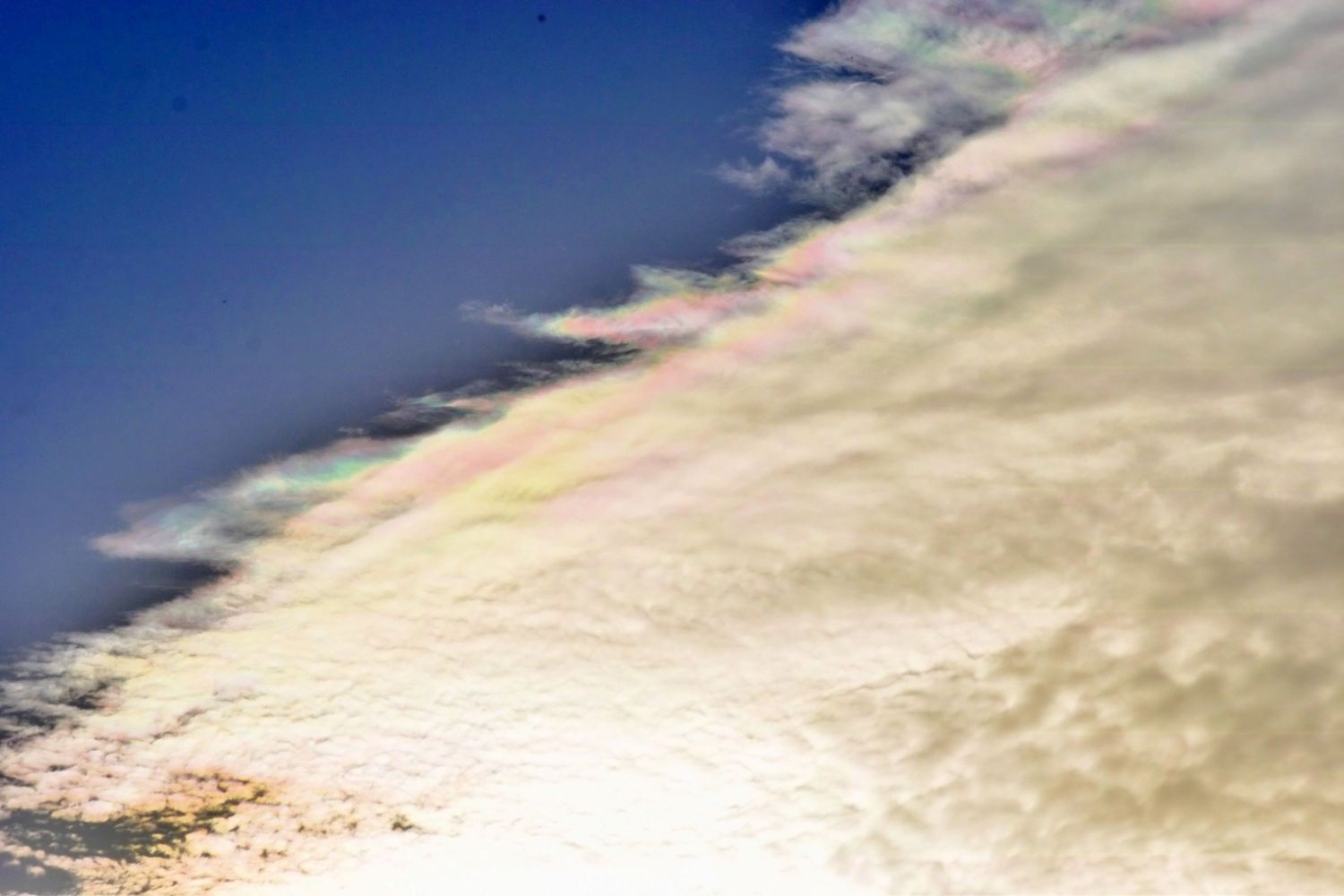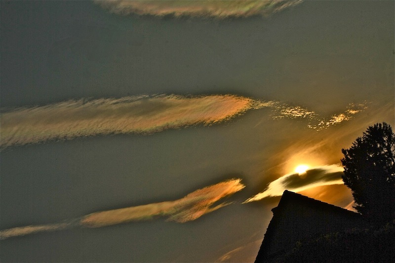nach einer strengen Kältennacht am 8.Oktober knapp am Gefrierpunkt vorbei, zeigte sich vormittags im Südosten eine intensive Korona um die Sonne. Immer wieder versuchten sich Punch-Holes zu formieren, Ansätze waren erkennbar im Altocumulus stratiformis und einem strammen Lüftchen aus Südost, das aber föhnig milde Luft nach dieser ungemütlich feuchtkühlen Nacht brachte. Bei solchen Wetterlagen kann man auf Punch Holes hoffen, oder aber auf starkes Irsisieren und so war es dann auch. Sehr ausgeprägt waren die Punch Holes leider nicht, es gab aber deutlich Schneisen im Ac str die von Flugzeugen erzeugt wurden. Die Kondensationskerne der Kerosinasche schlugen beim Absinken regelrechte Schneisen in die Wolken.