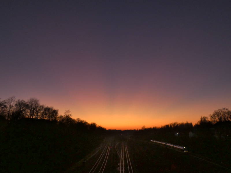 Hallo Peter,Heute abend gab es dann gegen 16.45 Uhr wieder ein intensiveres Purpurlicht, allerdings nicht ganz so hell wie gestern, dafür aber mit einem ganzen Fächer Dämmerungsstrahlen