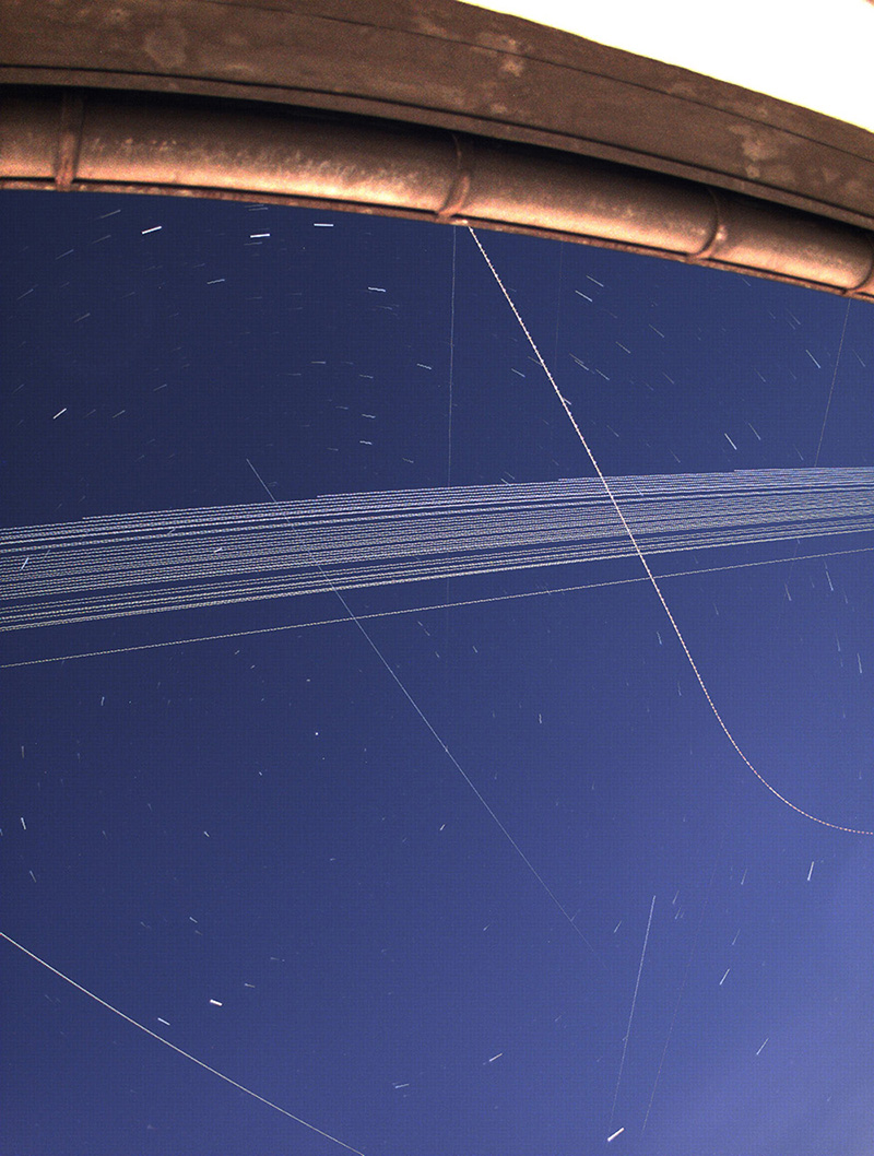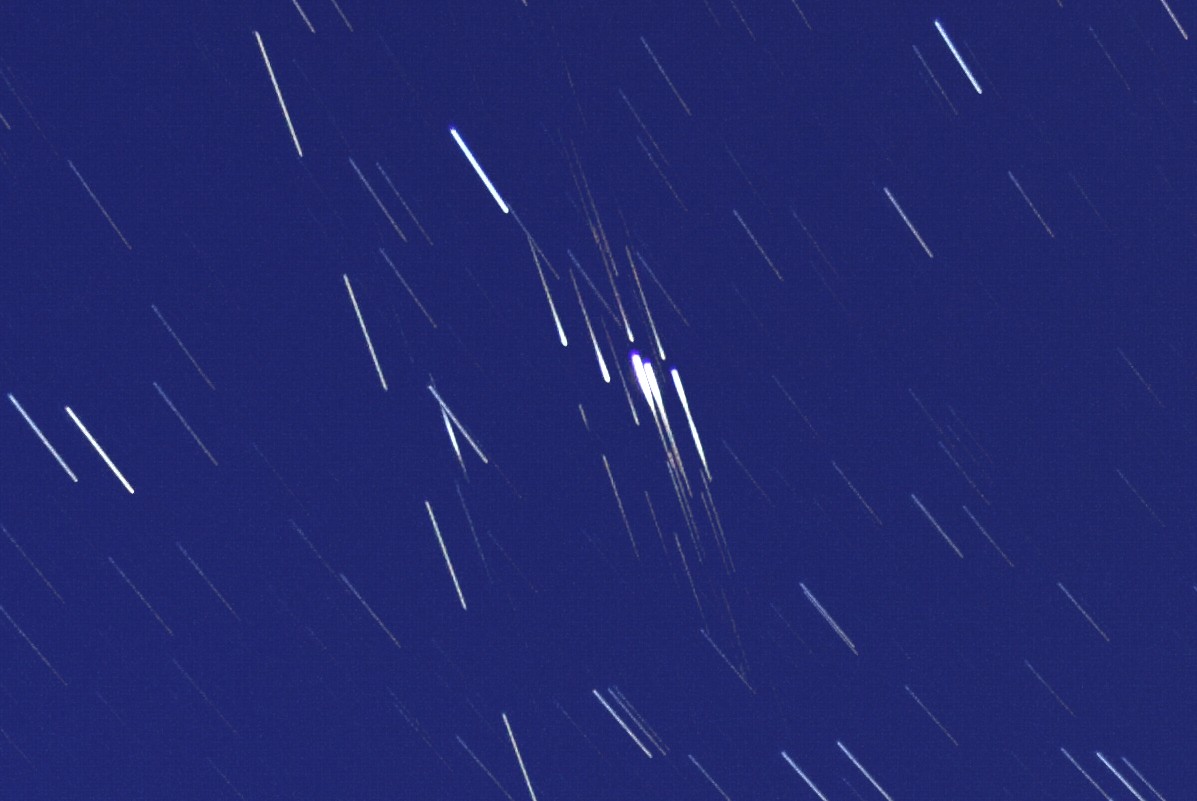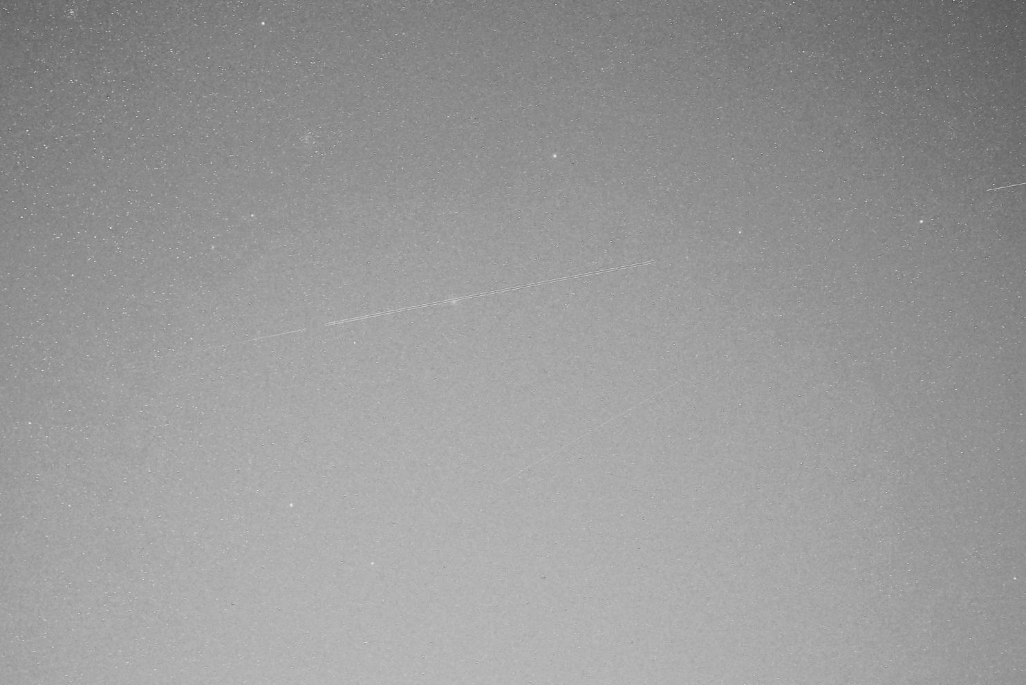 Wenn ich alle Bilder mit einem Maximum-Filter addiere, sieht man die "Autobahn" der Satelliten überdeutlich; bei einer Kombination mit Mittelwert sind sie hingegen nicht mehr zu erkennen.