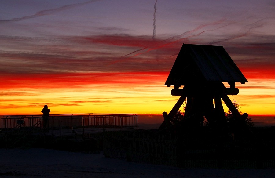 wir waren heute Morgen mal wieder auf dem Fichtelberg mit ein letztem bisschen Resthoffnung auf Eisnebelhalos. Die gab es natürlich nicht. Aber der Fichtelberg wäre nicht der Fichtelberg, wenn er uns mit leeren Taschen wieder heim schicken würde. Insofern zauberte er am Anfang ein schönes Morgenrot, welches sich bis in den Südwesten erstreckte.