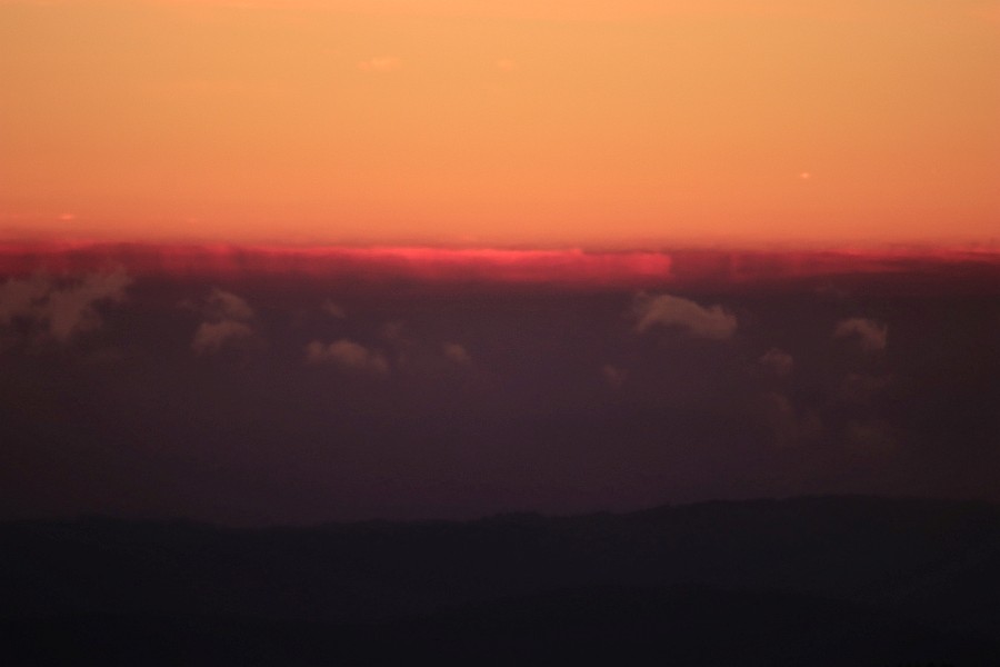 Bereits vor dem Sonnenaufgang gab es oberhalb der noch nicht aufgegangenen Sonne Luftspiegelungseffekte, in die hinein dann die Sonne aufging. Durch starken Wind wurde leider der obere Inversionsdeckel durchgepustet und es kam zu einer starken Luftunruhe. Insofern wirken die Bilder alle unscharf, obwohl sie das nicht sind. Mit der Russentonne filmen hätte bei WS7 auch nichts gebracht, das haben wir gleich sein lassen.
