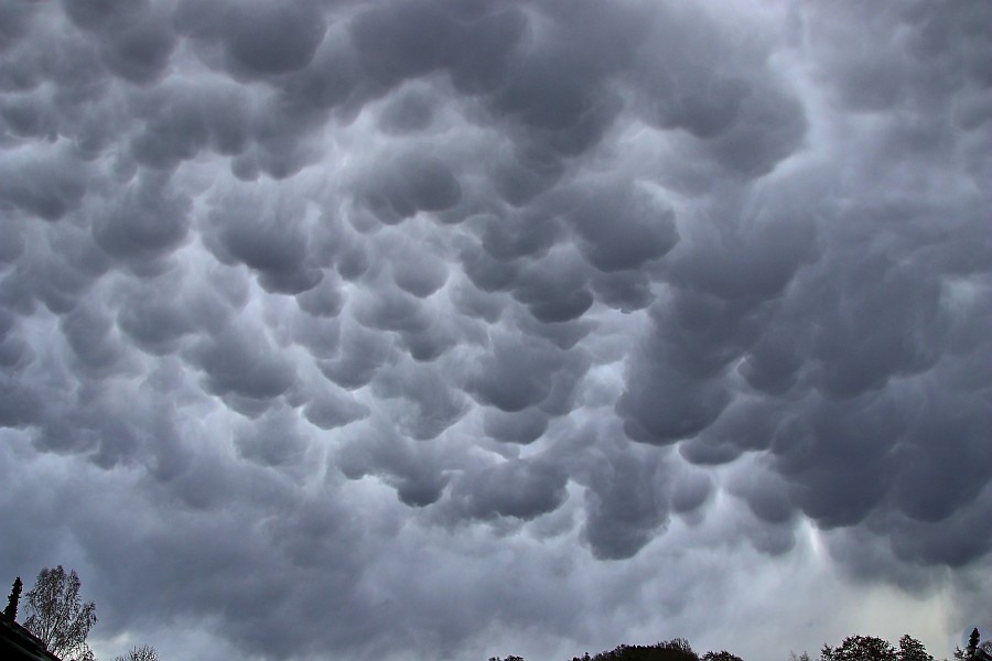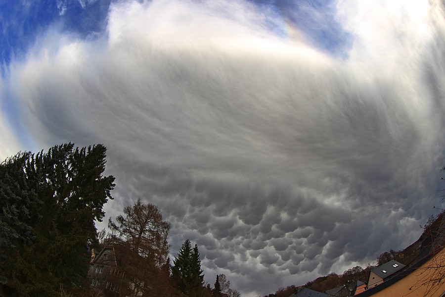 Ich hatte am 10.2. gegen 7 Uhr, ca. 30 Minuten nach dem Kaltfrontdurchgang mit Gewitter und Graupelschauer, auch fast den gesamten Himmel voll perfekter mammatus-Wolken (Sc str mam cbgen). Leider war's noch ziemlich dunkel (7 Uhr) und meine freihändigen Fotoversuche aus der Dunkelheit kann ich euch leider nicht anbieten, sind halt nur Belegbilder geworden.