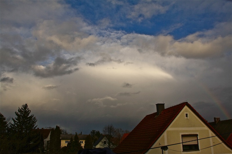 heute gegen 16h zeigte sich zunächst ein leichter Regenbogen in dieser konturenreichen Kaltfront, die bei uns im Wiener Becken aber kaum nennenswerten Niederschlag brachte. Im oberen Bogenteil des Regenbogens zeigte sich ein sehr intensives Leuchten in Form eines Bogens. Ist das wohl ein Wolkenbogen? Der wanderte mit dem Regenbogen mit und blieb immer in seiner oberen Mitte.