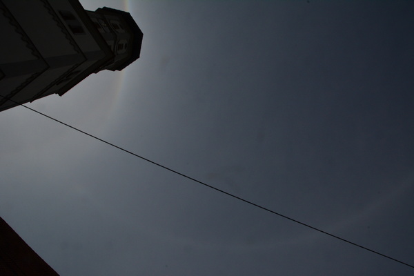 Nach dem Mittagessen bin ich schließlich mal ein paar Meter gegangen, um einen besseren Blick zu haben. Schließlich zeigte sich der linke Infraglateralbogen visuell, sodass zusammen mit der schwach visuellen Nebensonne ein kleines Halophänomen zusammen war. Den 46° Halo konnte ich weiterhin nicht sehen.