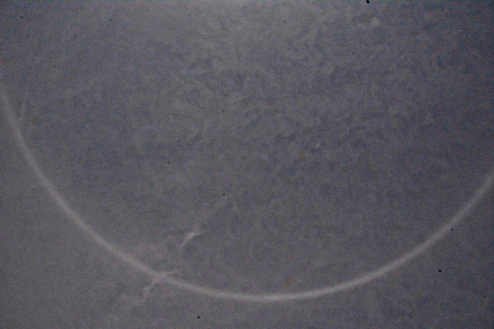 (Bild 7119: 3200 ISO – die hatte ich noch von den Starlink-Aufnahmen des Abends davor eingestellt; zwar ist das Rauschen recht hoch, aber dafür kommen die Farben und die Halos etwas besser zur Geltung): 2. Auf den Bildern um 10:50 meine ich einen 9°-Ring zu sehen, bin mir aber sehr unsicher, ob dieser nicht ein Artefakt ist. Deshalb ließ mich die Beobachtung von Florian aufmerken: War da doch etwas 9°-mäßiges in der Luft? Hierzu sei ergänzend bemerkt, dass während der gesamten Beobachtungszeit der 22°-Ring auffällig breit und diffus war. Auf den Bildern um 10:50 erscheint er wie ein Band, das an beiden Rändern recht scharf definiert ist. Das „verschwommene“ Aussehen des Halokreises fällt mir im Nachhinein richtig ins Auge – umso größer der Ärger, nicht genauer hingeschaut zu haben! (Ich hatte die Aufnahmen lediglich unter dem Gesichtspunkt gemacht, um im Nachhinein die Dauer der einzelnen Erscheinungen bestimmen zu können und war nicht darauf gefasst, etwas ungewöhnliches könnte sich am Himmel abspielen...). Erst am Ende (12:45) erschien er wieder gewöhnlich schmal zu sein. Auf den Bildern hierzu ist auch der Umschriebene Halo weit hinabreichend zu erkennen. Von Nebensonnen und parhelischem Ring keine Spur. 3. Und ein Drittes ist mir auf zahlreichen Fotos aus der Zeit des Halo-Phänomens aufgefallen: es ist ein dunkler parabelförmiger „Bogen“, der oberhalb des Parrybogens kulminiert und seitlich weit über die Nebensonnen hinausgreift. Ich halte dies für ein Artefakt, aber diese Parabel ist auf mehreren Bildern zu erkennen, so dass mir das als Artefakt anzusehen schwer fällt! Auf einigen Bildern habe ich sogar den Eindruck, er sie der Rand eines Halo-Bogens (!): Christoph
