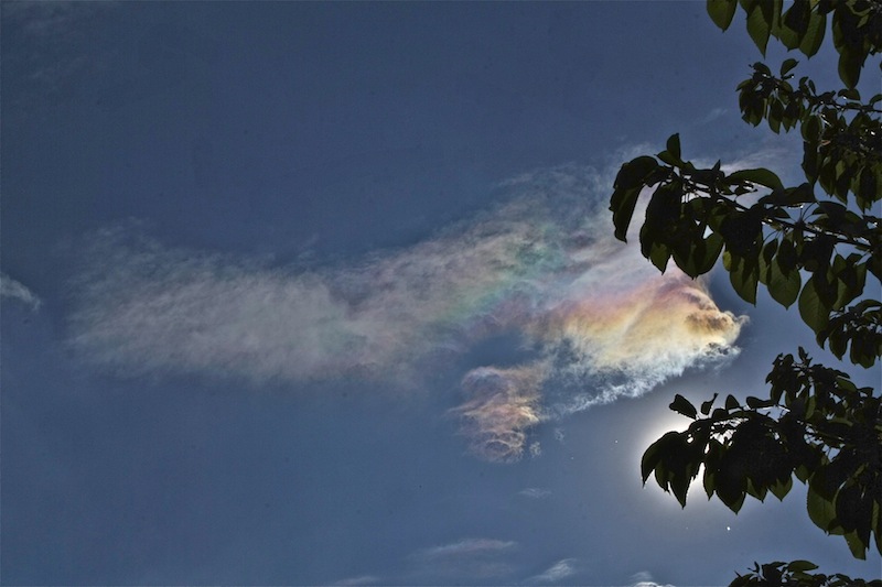 In trockener Luft bei 28%RF und 23 Grad zeigten sich heute Nachmittag zusammen mit Ac len im leichten Föhn aus Ost diese irisierenden Wolken über dem Wiener Becken. Ich meine auch eine sehr leichte Korona um die Sonne wahrnehmen zu können.