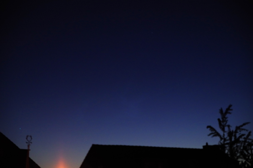 Die visuell wahrnehmbaren Strukturen waren in dieser Nacht zum Großteil diffus und verbunden mit starkem Dunst, teils Nebel und Hochnebel, schwierig in ihrer Gesamtheit zu erfassen. Das obige Bild stellt den Höhepunkt der bei mir wahrnehmbaren Stukturen dar (Helligkeit 2) und wurde bei einer Sonnendepression von 11,0° aufgenommen.