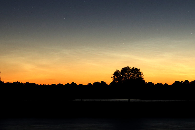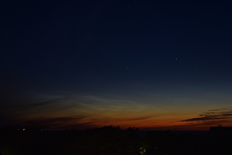 Hier in Greifswald waren die NLC zwischen 01:00 und 02:45 auch zu sehen, die Helligkeit lag zwischen 1 und 2 und man konnte sie gerade so mit dem Auge erkennen. Allerdings waren sie ziemlich schwach und im Dämmerungsstreifen auch recht kontrastarm und haben sich recht früh wieder aufgelöst.