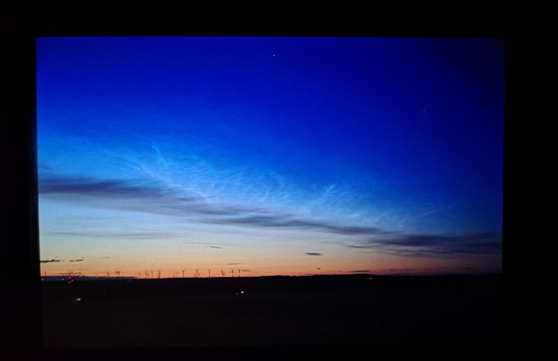 Leider habe ich sie nicht von Anfang an mitbekommen, was wohl an der Bewölkung lag. Gegen 22:45 fiel mir im NNO etwas auf, was NLCs gewesen sein könnten. Kurz darauf erschienen die NLCs bis in ca. 20° Höhe, deutlich sichtbar besonders gegen kurz nach 23:00. Leider kam alsbald eine Wolkenwand aus Westen, die sich davorschob. Ich blieb noch etwas, da vielleicht bei sinkendem Sonnenstand horizontnähere NLCs auftauchen würden, und ich konnte auch etwas ausmachen. Jedoch sehr kontrastarm und die Wolkenlücken wurden kleiner. Also bin ich abgeschoben.