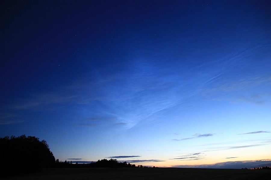 Leider habe ich sie nicht von Anfang an mitbekommen, was wohl an der Bewölkung lag. Gegen 22:45 fiel mir im NNO etwas auf, was NLCs gewesen sein könnten. Kurz darauf erschienen die NLCs bis in ca. 20° Höhe, deutlich sichtbar besonders gegen kurz nach 23:00. Leider kam alsbald eine Wolkenwand aus Westen, die sich davorschob. Ich blieb noch etwas, da vielleicht bei sinkendem Sonnenstand horizontnähere NLCs auftauchen würden, und ich konnte auch etwas ausmachen. Jedoch sehr kontrastarm und die Wolkenlücken wurden kleiner. Also bin ich abgeschoben.