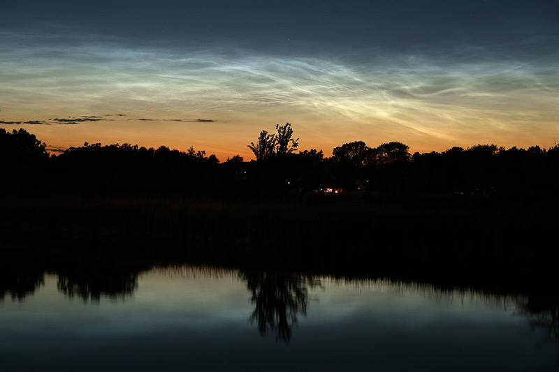 Die Leuchtenden Nachtwolken in der 1. Nachthälfte fielen hier im Spreewald leider den Wolken zum Opfer. In der 2. war dann ein hübsches horizontnahes Feld Richtung NNW bis NNO zwischen größeren Wolkenlücken erkennbar (Höhe ca. 7°, Helligkeit 3), das leider nicht an das NLC-Display der 1. Nachthälfte heranreichen konnte. Weiter Richtung NO zeigten sich schwächere NLC in etwas größerer Höhe (~25°, Helligkeit 1-2).