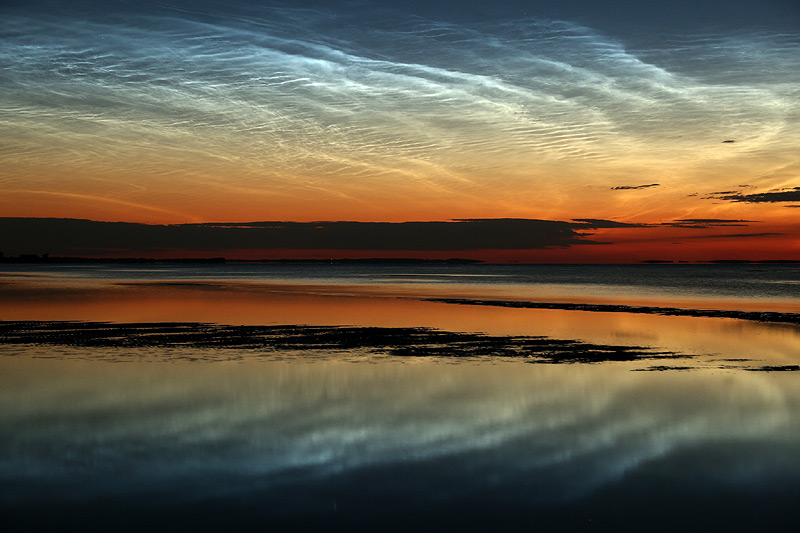 Große NLC Felder am Abend habe ich nun schon ein paar gesehen und sie haben so ihre eigenen Gesetze. Anfangs kann man sie leicht mit hohen Kondensstreifen und vergleichbaren Strukturen verwechseln, daraus entwickeln sich dann aber leuchtende Nachtwolken. Heute habe ich schon auf dem Hinweg zum Ryck so einen verdächtigen Kondensstreifen etwas westlich von mir hoch oben von Nord nach Süd laufen sehen. Am Ryck angekommen, sah man dann auch den Rest des Feldes, das insgesamt nur wenig Kontrast aufwies und abgesehen von den großen Ausmaßen nicht spektakulär aussah. Aber so sind solche großen Felder eben, da sie nur sichtbar sind, wenn die Sonne noch nicht weit unter dem Horizont verschwunden ist, haben sie auch wenig Kontrast zum Himmel.