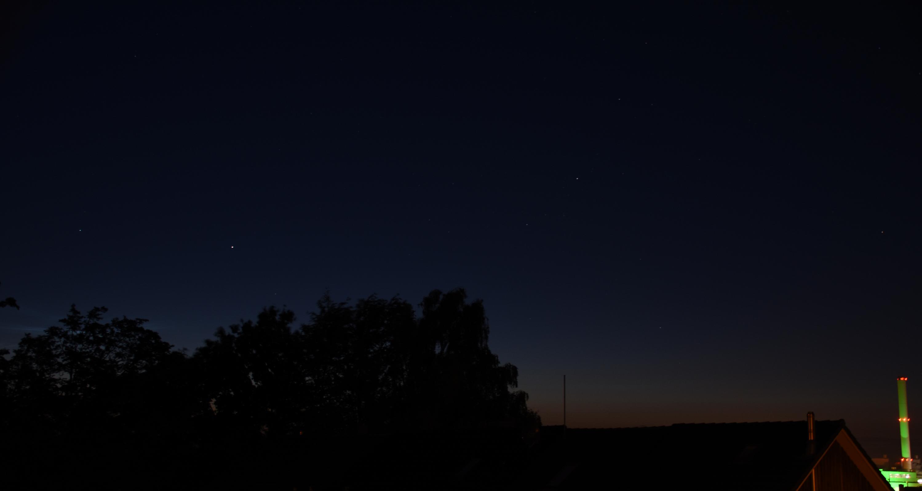 Pollux (der linke) verschwindet dann schnell. Capella, als hellster Stern, befindet sich anfangs über dem Haus noch deutlich vor ihrem niedrigsten Stand in N. Dort (außerhalb des Bildfeldes) ist sie bei mir in 10° Höhe (nicht auf diesem Video):