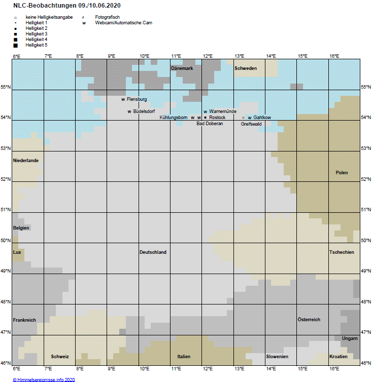wetterbedingt (Abb. 1) waren die NLCs der Nacht 09.&/10.06.2020 lediglich im norddeutschen Küstengebiet sichtbar (Abb. 2).