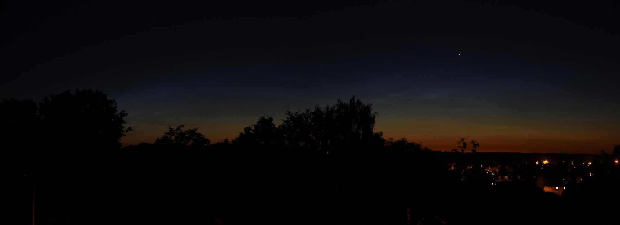 es scheint als seien die NLC weiter westlich eindrucksvoller gewesen. Hier aus Zeitmangel und wegen Übermüdung nur ein Panorama mit 58 mm von 2:46 MESZ aus der Nähe von Westerrade in S-H. Da reichten die NLC immerhin bis 15° Höhe und bedeckten den gesamten Nordhorizont von 300 bis 70°. Tolle Strukturen dabei und Helligkeit 3. Teilweise hatten die intensiven Bänder auch 4. In dem Panorama fehlt aber noch der östliche Teil. Alles weitere später heute.