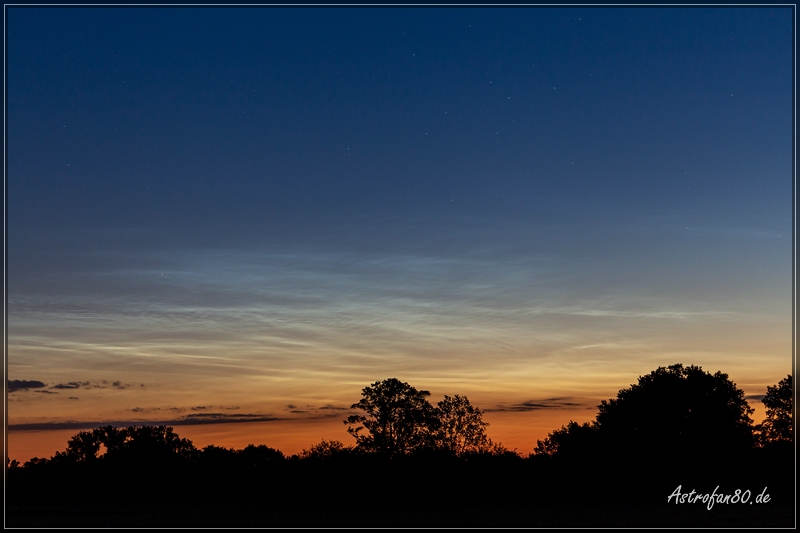 Heute mal NLC vom Balkon, Helligkeit gefühlt 1, da eigentlich nur richtig mit der Kamera zu sehen und auch im horizontnahen Dunst eingebettet. Die Aufnahme entstand gegen 00:15 Uhr MESZ