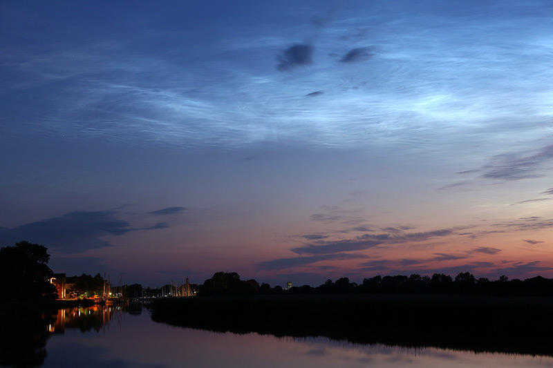 Danach begab ich mich an den Ryck und suchte eine Position auf, die mir einen halbwegs brauchbaren Blick in westliche Richtung versprach. Normalerweise sind die NLC ja auf die andere Seite vom Ryck beschränkt, also auf das nördliche Ufer. Heute aber war das anders, die NLC reichten bis weit in den Westen.