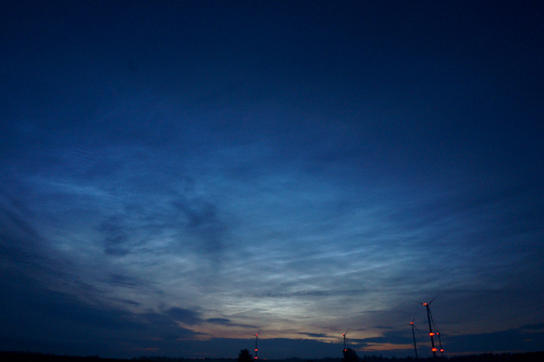 Auch von mir eine Sichtung von gestern Abend. Die letzten Male hatte es entweder aus persönlichen Gründen oder wetterbedingt nicht geklappt, wobei auch dieses Mal die Wetterbedingung nicht ganz optimal waren (Wolken, Dunst bzw. Nebel). Die NLCs hatte ich per Zufall schon um 22:15 MESZ gesehen und bin dann anschließend ins Feld raus gefahren. Zu dem Zeitpunkt reichten das NLC-Feld teilweise über den Zenit. Genaue Angaben zur Ausdehnung kann ich nicht wirklich machen, da sehr viele Wolken störten, dort wo es aber sichtbar war, reichte es von Nord bis Nordost (350° bis 40°). Für die Helligkeit würde ich eine 3 bis 4 vergeben, ohne die Wolken wäre es bestimmt noch viel heller gewesen. Beobachtungsort war Kirchhain und Ende der Beobachtung um 23:17 MESZ aufgrund von zunehmender Bewölkung und dichter werdenden Nebel.