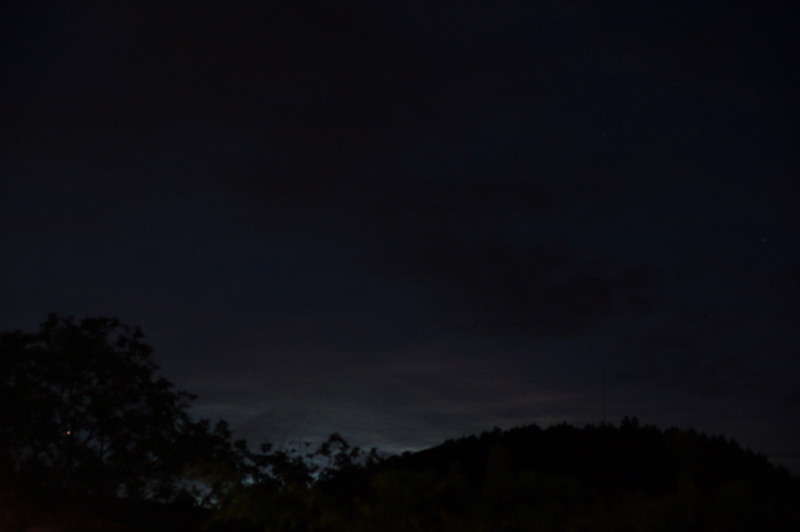 Als erstes fielen mir auf meiner kurzen Fahrt dunkle Wolken im Norden auf und ich dachte schon, das diese mir den Blick auf die NLC verbergen werden, aber an der nächsten Ecke sah ich dann ein helles, weißes Feld leuchtender Nachtwolken im Westen stehen. Da solche großen Displays oft schnell in sich zusammen fallen, machte ich in einem kleinen Park eine erste Fotopause und an einer Kreuzung eine zweite. Auf mehreren Bildern, die ich an der Kreuzung gemacht habe kann man übrigens schön erkennen, das die NLC in Richtung Süden unterwegs waren.
