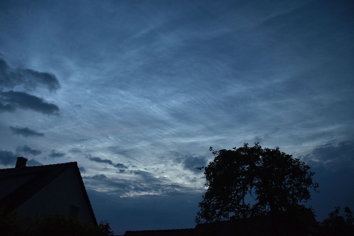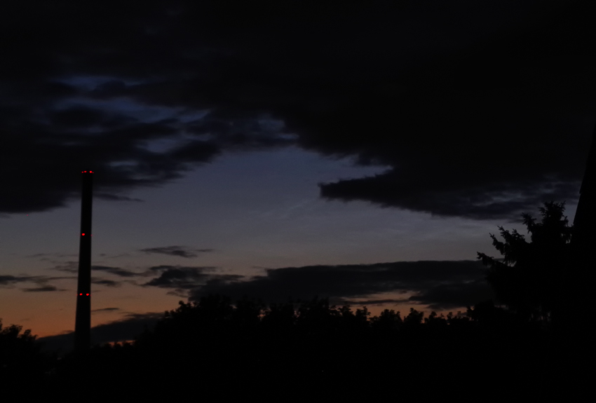 Beobachtungszeitraum der NLCs: 22:25 MESZ (bereits fotografisch nachweisbar, Sonnenstand bei -4,9°) - 23:49 MESZ (Erzwungenes Beobachtungsende - Bewölkung)