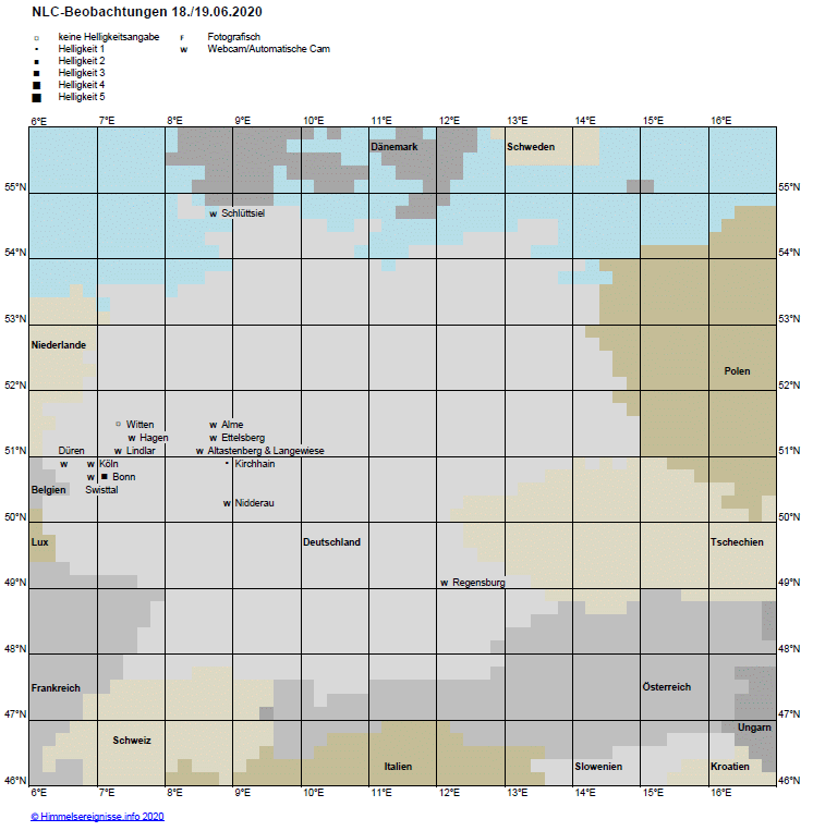 NLCs traten in der Nacht 18./19. Juni 2020 erst nach der astronomischen Mitternacht in Erscheinung. Die Verteilung der Beobachtungen (Abb. 1) - hauptsächlich an automatischen Webcams - spiegelt die Bewölkungssituation (Abb. 2) gut wider. Gemäß Ausmessung des Belegfotos aus Bonn zog sich der Südrand des NLC-Feldes um 03:32 MESZ entlang des 54. Breitengrades von Den Helder bis Hamburg (Abb. 3). Da das Display weder einen Dämerungssaum zeigte noch in den folgenden 20 Minuten höher stieg, können wir sicher sein, dass es sich dabei nicht um einen terminatorbedingten, sondern um den wahren Südrand gehandelt hat.
