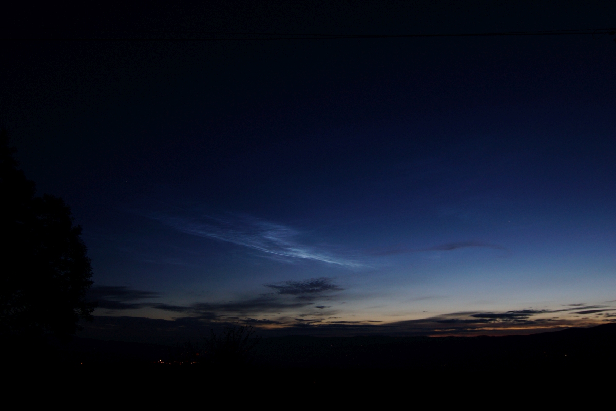 Die Sichtbedingungen waren eingeschränkt, da ich in Hemmingstedt am Rande einer von NW nach SO verlaufender dichter Bewölkung lag. Zu Mitternacht wurde es etwas besser und die ersten NLC schienen durch den Dunst und durch das Cirren-Gewölk.