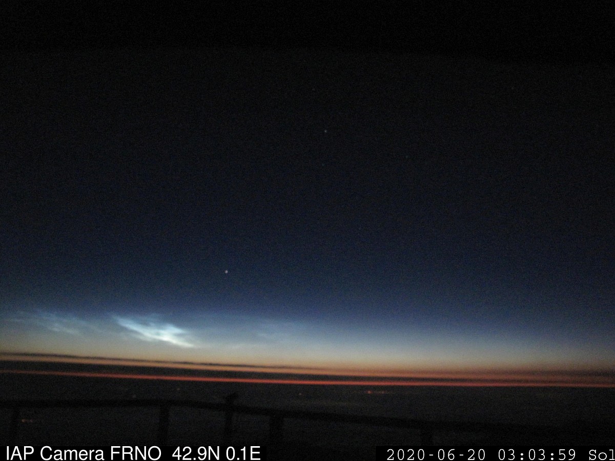 Teile des Morgendisplays sind, nachdem die Reise sehr gut über diverse Webcams unterschiedlicher Breitengrade der Alpen nachvollziehbar ist, gerade auf mehreren Pyrenäen-Cams, unter anderem auf der IAP-Cam "FRNO" vom Pic du Midi de Bigorre (Belegfoto weiter unten) & den französischen Panorama-Kameras zu sehen. Die Webcams mit an der Wasseroberfläche von Seen gespiegelten NLCs bzw. durch die offensichtlich sehr hellen NLCs deutlich aufgehellten Wasseroberflächen habe ich mal blau eingefärbt. Meine persönlichen Favoriten sind der Tiefblick vom Mount Vodno auf das Lichtermeer von Skopje mit dem beleuchteten Jahrtausendkreuz im Gipfelbereich und den NLCs über dem gegenüberliegenden Gebirgszug und die Kombination aus Nebelmeer, NLCs und einem beeindruckenden Alpenpanorama vom Croix des Salles bei Combloux (04:34 MESZ).