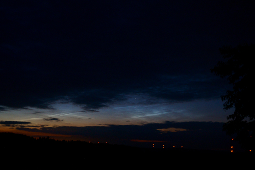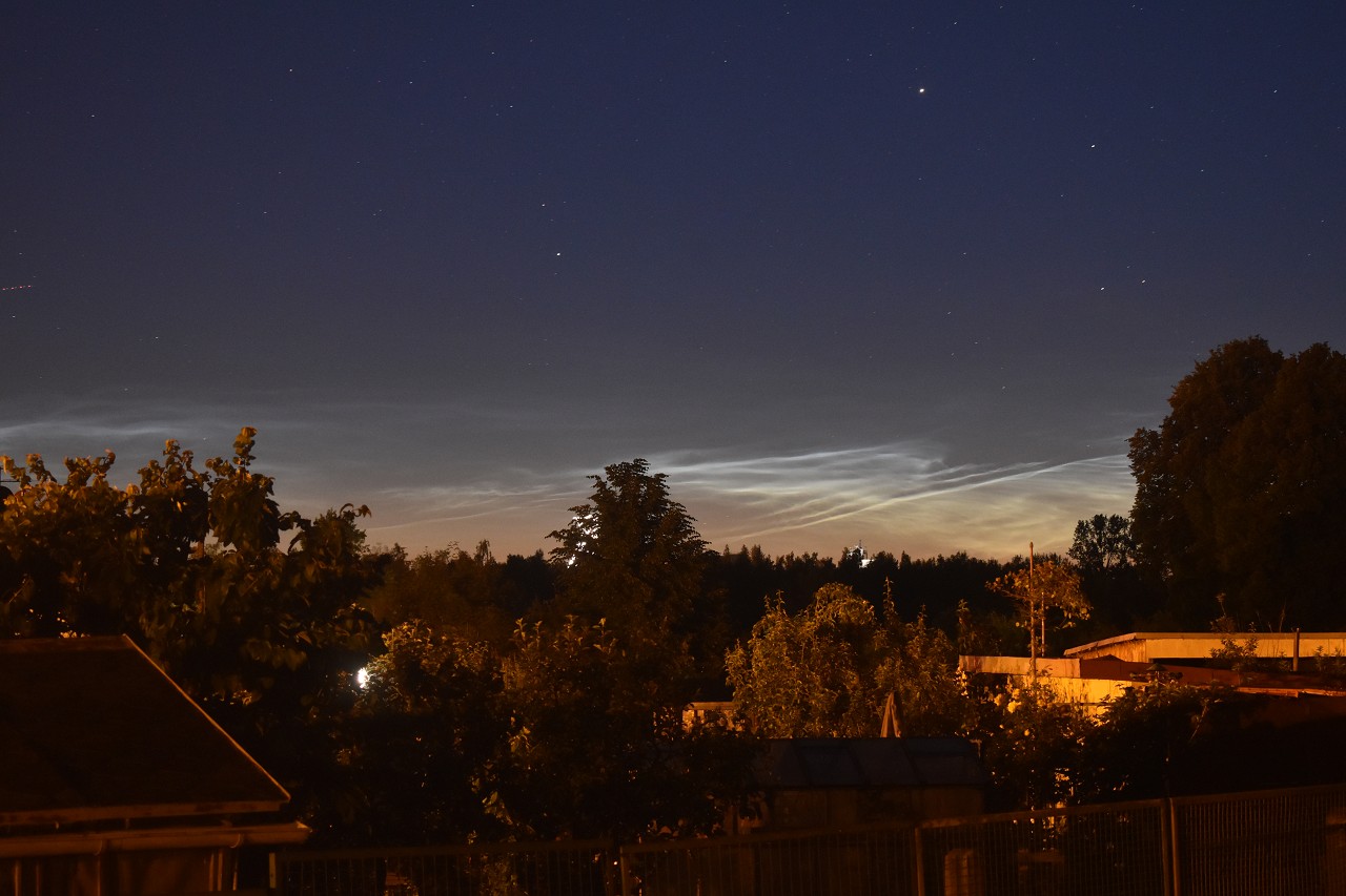 Bereits bei Ankunft (Sonnenstand -13°) waren diverse NLCs im Nordsektor erkennbar, Helligkeit 1. Relativ schnell entwickelte sich daraus eine Formen-prächtige Show: Werden, Vergehen, Verändern. Je näher die Sonne sich von unten an den Horizont heran schlich, umso klarer wurde, dass auch ganz ganz weit im Westen noch NLC sind, und dass sich helle Bänder von ca. Ost bis weit nach Südsüdosten erstrecken. Speziell diese Bänder, aber auch NLC-Wölkchen hoch über mir und südlich des Zenits, konnten noch auf dem Weg zum Bahnhof bis gegen 4Uhr (Sonnenstand ca. -5°) verfolgt werden.