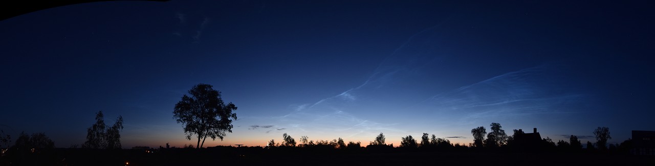 Bereits bei Ankunft (Sonnenstand -13°) waren diverse NLCs im Nordsektor erkennbar, Helligkeit 1. Relativ schnell entwickelte sich daraus eine Formen-prächtige Show: Werden, Vergehen, Verändern. Je näher die Sonne sich von unten an den Horizont heran schlich, umso klarer wurde, dass auch ganz ganz weit im Westen noch NLC sind, und dass sich helle Bänder von ca. Ost bis weit nach Südsüdosten erstrecken. Speziell diese Bänder, aber auch NLC-Wölkchen hoch über mir und südlich des Zenits, konnten noch auf dem Weg zum Bahnhof bis gegen 4Uhr (Sonnenstand ca. -5°) verfolgt werden.