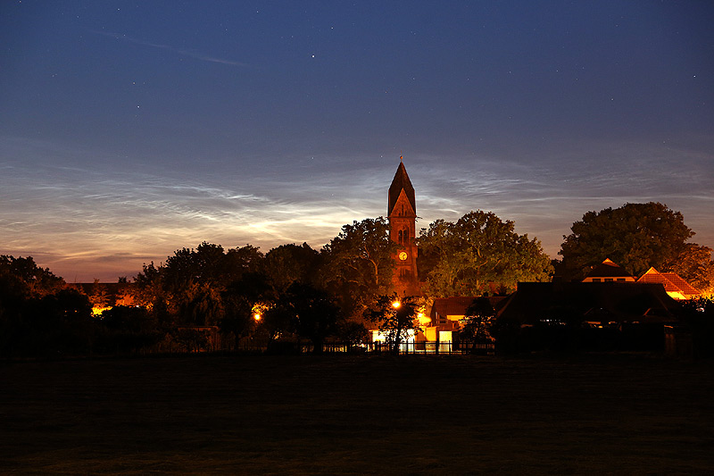 Bild 9: Greifswald Ladebow, Kirche vor NLC Spätestens hier nun machte ich einen Fehler. Da das Display über Mitternacht nicht geschrumpft, sondern gefühlt sogar etwas angewachsen war, entschloss ich mich, den holprigen Weg durch den Wald nach Wampen anzutreten, um dort wieder tolle Fotos von NLC über kleinen Sandbänken und spiegelglattem Wasser zu machen.