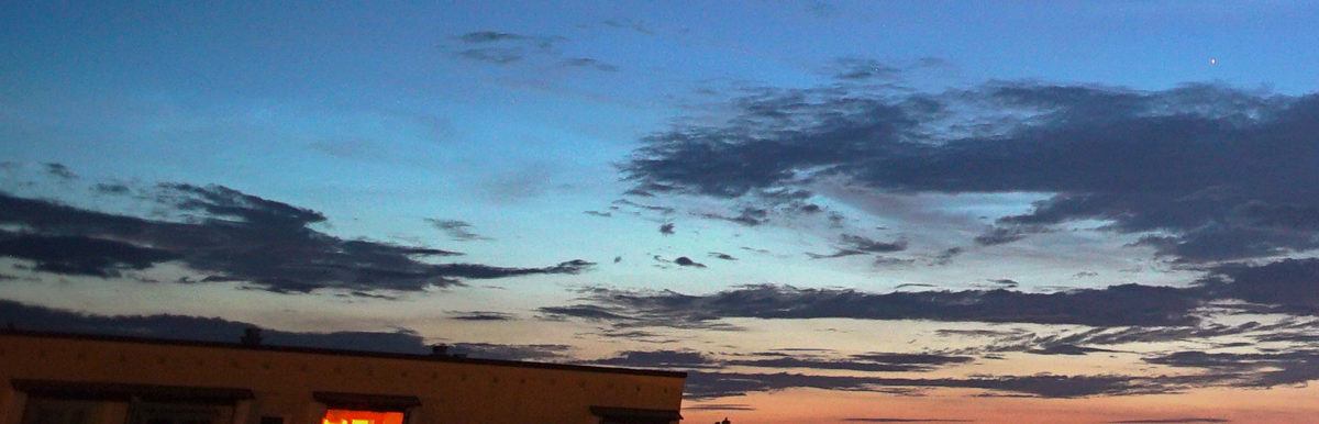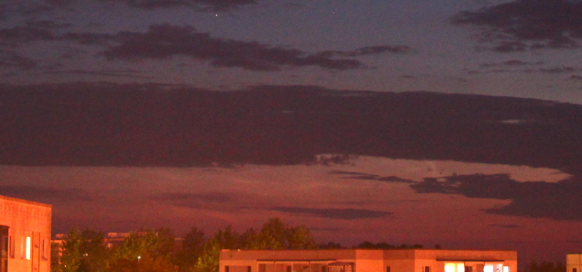 Um 0:10 Uhr MESZ war ungefähr die größte Helligkeit erreicht. Deutlich war der diagonale Streifen zu erkennen. Wären die NLC größer gewesen, wären sie sicher auch Zufallsbeobachtern aufgefallen. Horizontnah und klein waren sie eher was für Eingeweihte. Helligkeit also 3, vielleicht sogar 4.